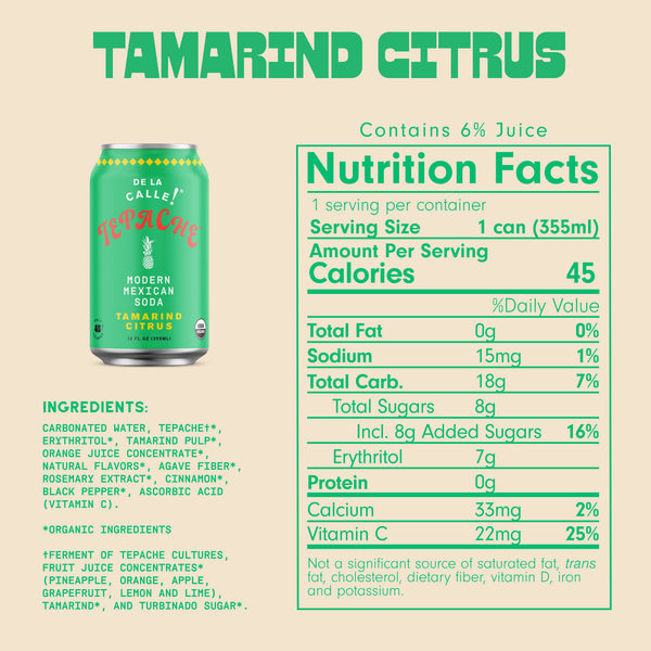 Carbonated Water, Tepache*, Erythritol*, Tamarind*, Orange Juice Concentrate*, Pineapple Flavor*, Agave Inulin*, Rosemary Extract*, Cinnamon Extract*, Black Pepper Extract*, Orange Extract*, Ascorbic Acid (Vitamin C). *Organic Ingredients