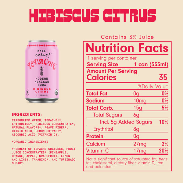 Carbonated Water, Tepache*, Erythritol*, Hibiscus Concentrate*, Hibiscus Flavor*, Agave Inulin*, Citric Acid, Lemon Extract*, Ascorbic Acid (Vitamin C). *Organic Ingredients