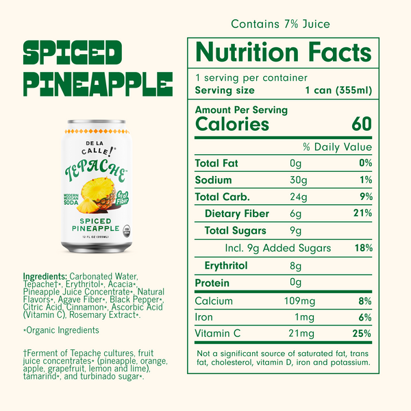 Carbonated Water, Tepache*, Erythritol*, Acacia*, Pineapple Juice Concentrate*, Pineapple Flavor*, Agave Inulin*, Black Pepper Extract*, Citric Acid, Cinnamon Extract*, Ascorbic Acid (Vitamin C). *Organic Ingredients